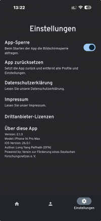 In den Einstellungen ist es möglich, den Zugang zur App zu sperren. Hierfür können beispielsweise biometrische Verfahren wie Gesichtserkennung oder Fingerabdruck zur Entsperrung der easyroam App genutzt werden. Dies ermöglicht eine Einschränkung des unbefugten Zugriffs auf die easyroam Profile. Durch die Schaltfläche “App zurücksetzen” wird ein vorab auf dem Endgerät installiertes easyroam Zertifikat widerrufen und anschließend gelöscht. Nutzende müssen sich anschließend erneut über ihren DFN-AAI-IdP oder den QR-Code anmelden, um ein neues easyroam Zertifikat zu erhalten. Die restlichen Schaltflächen in den Einstellungen sind selbsterklärend.