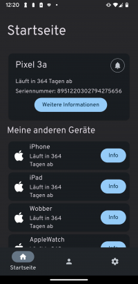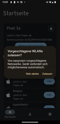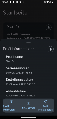 Solange ein gültiges Pseudozertifikat auf dem Endgerät vorhanden ist, meldet sich dieses, unabhängig vom Betriebssystem Android oder iOS, stets mit dem gültigen Pseudozertifikat in easyroam an. Im Hauptmenü ist es über die Schaltfläche „Weitere Informationen“ möglich, das aktuell installierte Profil zu erneuern, neu zu installieren oder zu widerrufen. Durch Anklicken des Glockensymbols wird die easyroam App autorisiert, die Nutzenden zu informieren, wenn ein Profil kurz vor dem Ablauf steht.