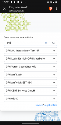 Es gibt zwei Möglichkeiten zur Anmeldung in easyroam „Mit dem Browser fortfahren“ oder „per QR-Code fortfahren“. Mit dem Browser ist die Anmeldung über den WAYF (Where Are You From) mit einem DFN-AAI-IdP Account erforderlich. Hat man einen Laptop oder ein Desktop-Gerät in der Nähe, so kann man sich mit diesen Geräten über das Portal www.easyroam.de im Browser in easyroam anmelden und einen QR-Code (5 Minuten gültig) generieren, den man dann in der easyroam app auf dem ANDROID Gerät (mit Kamera) einlesen kann. Im letzteren Fall wird Schritt 3. übersprungen.