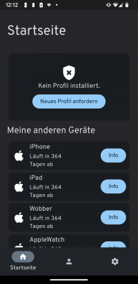 5. Mit einem Klick auf „Neues Profil anfordern“ startet der Installationsprozess des Profils. Bei einer Neuinstallation der easyroam App erscheint eine Meldung des Betriebssystem. Diese Meldung erscheint bei einer Erneuerung des Profils nicht mehr.