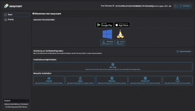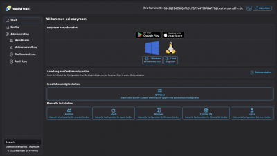 Die Web-Seite www.easyroam.de dient der Verwaltung der eduroam Profile durch die eduroam Nutzenden. Bitte die Installationsanleitungen s.u. oder Inhaltsverzeichnis beachten! Nach dem Aufruf der Seite https://www.easyroam.de im Browser und der Autorisierung über den DFN-AAI IdP startet das Hauptmenü „Start“: