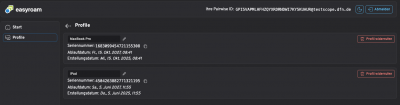 Hier kann die Seriennummer des Zertifikats sowie dessen Gültigkeitsdauer eingesehen werden. Wird ein Zertifikat widerrufen, ist es umgehend für die Nutzung in easyroam gesperrt. Die Gültigkeitsdauer der eduroam-Profile wird in der Regel von den easyroam-Administratoren der Einrichtungen festgelegt. Wird von den easyroam-Administratoren keine Gültigkeitsdauer für die eduroam-Profile festgelegt, sind diese drei Monate gültig.