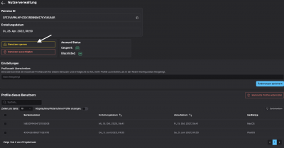 In der „Nutzerverwaltung“ ist eine gezielte Suche nach der Pairwise-ID möglich. Admins aben unter anderem die Möglichkeit, Nutzer zu (ent)sperren, die Anzahl der Profile, die ein Nutzer maximal haben darf, individuell zu überschreiben sowie die Profile der Person einzusehen oder zu widerrufen.