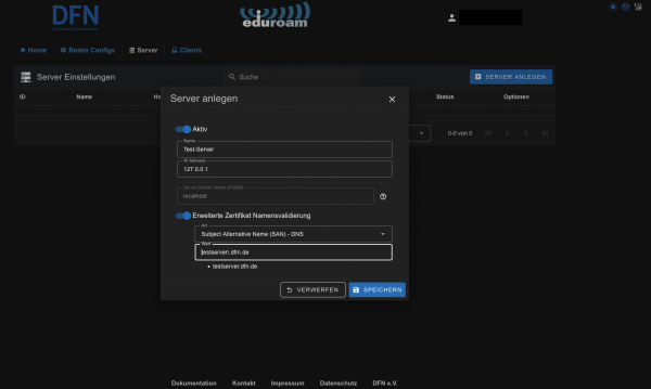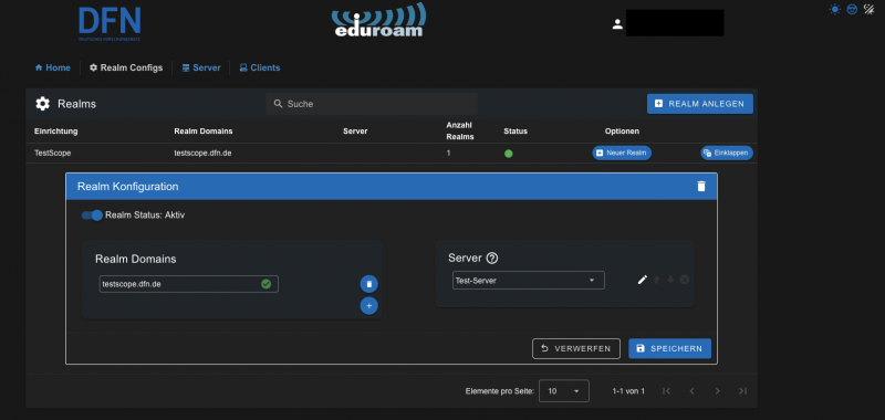 In der Menüoption „Realm Configs“ werden die für das Routing der eduroam-Anfragen notwendigen Realms hinterlegt und mindestens einem Server zugeordnet.