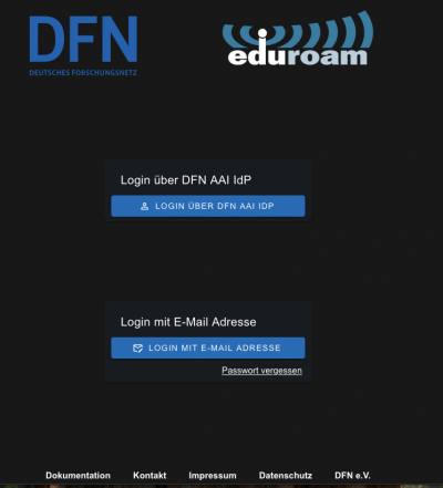 Es existieren mit Einschränkung zwei Möglichkeiten des Login. Der Login für eduroam Identity Provider und eduroam Service Provider ist ausschließlich über einen DFN-AAI Identity Provider möglich. Organisationen in eduroam, die nur einen eduroam Service Provider und keinen eduroam Identity Provider stellen, können in der Regel die E-Mail Adresse zur Anmeldung benutzen. Der Login mit der E-Mail Adresse ist zusätzlich durch ein One-Time-Password (OTP) abgesichert.