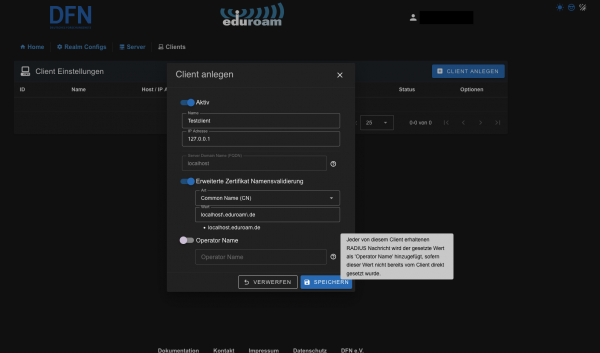 Ein eduroam Identity Provider muss auch einen eduroam Service Provider aktiv bereitstellen. Die Registrierung der Clients erfolgt analog zu den Servern. Optional kann hier der Operator Name eingetragen werden. Üblicherweise steht vor dem Operator Namen, gemäß dem Standard, eine “1”. Die “1” sollte nicht eingetragen werden, da sie vom System automatisch hinzugefügt wird.